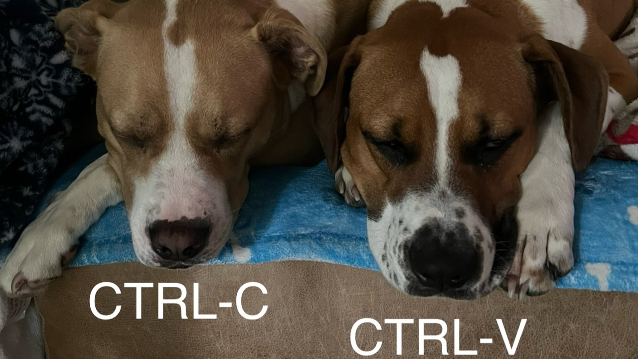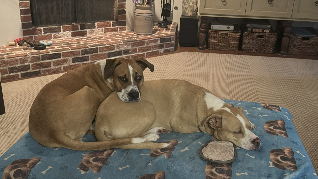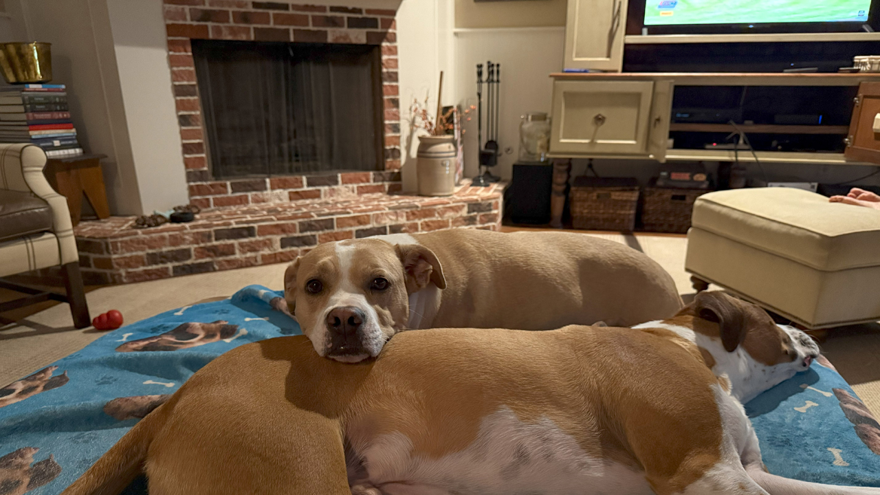The dogs are not related but they do look very similar. Rusty has grown up to be a little taller, skinnier, floppier, browner, and dumber than Axle is. But they are best friends and can often be found napping on each other or biting each other, in equal quantities.
