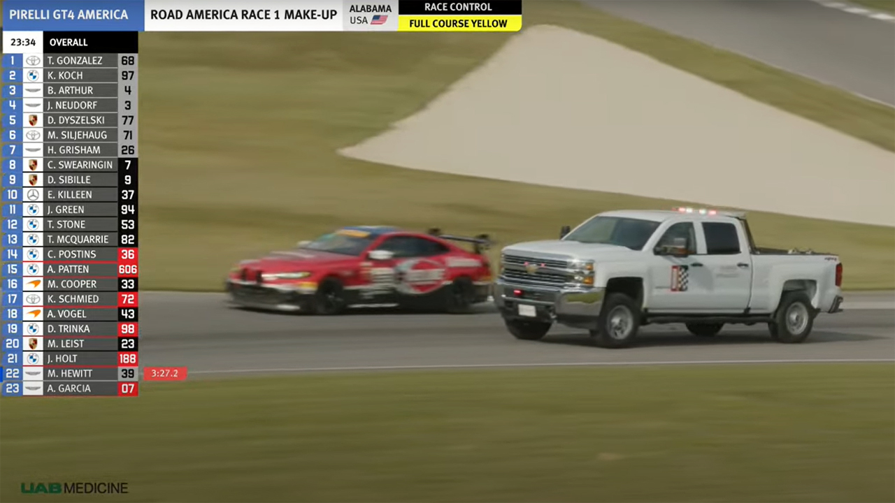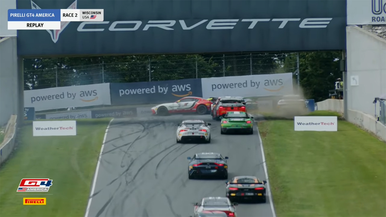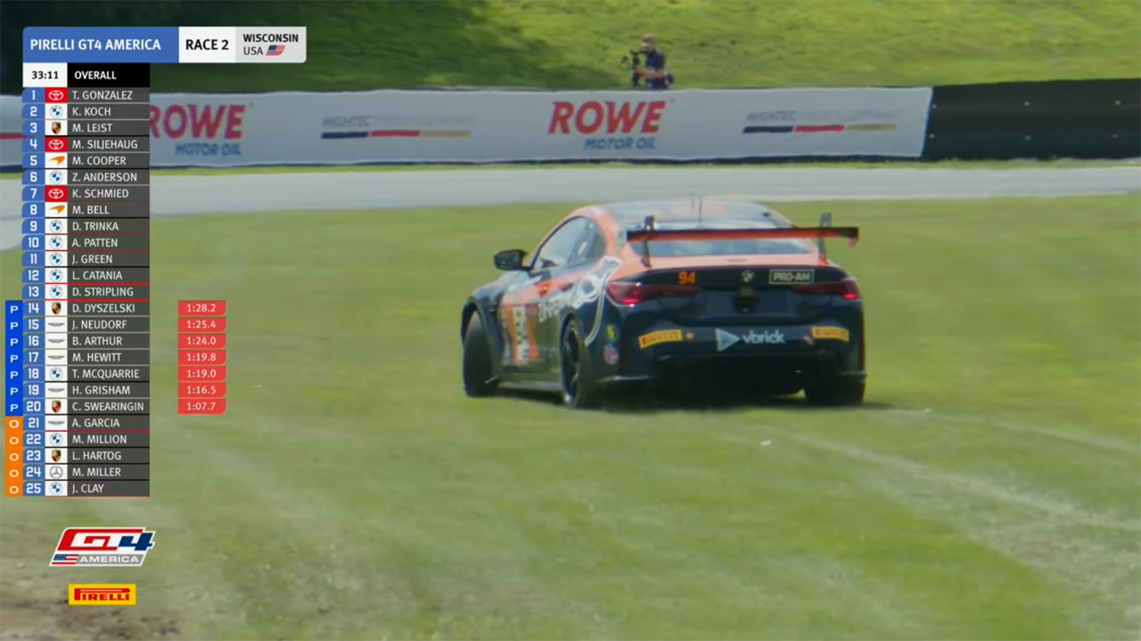 A: They did. GT4 America awards points for the top ten cars regardless of finishing status, and with a field of nine or ten in class each weekend, points are almost guaranteed for all who start the race. Not all racing series operate like this, but SRO does. Therefore, you will receive points unless you race with an incorrect power setting on your car, which enables you to make an impressive comeback from far down in the field, but also disqualifies you. Honest mistake from our Am friends in the garbage truck. They’re cool off track, according to my secret inside source. They’re cool on track too, just annoyingly fast. Ultimately, the Pro-Am Vandals escaped Road America with two points despite the broken axle.