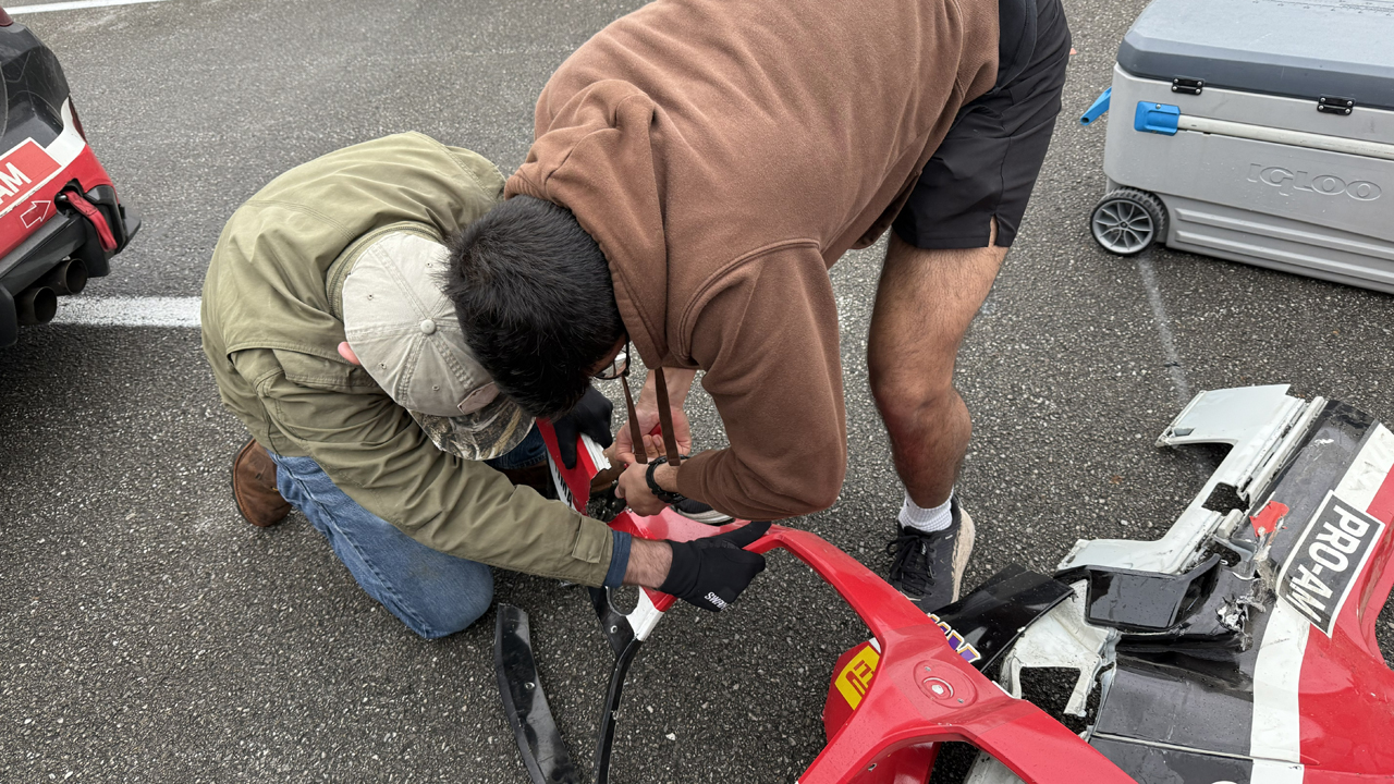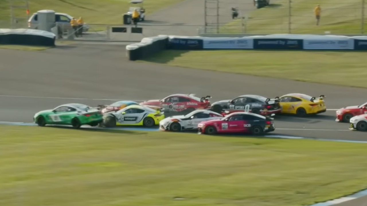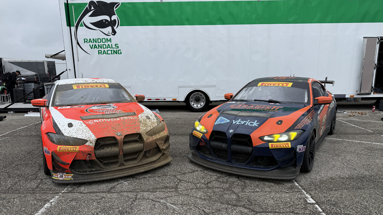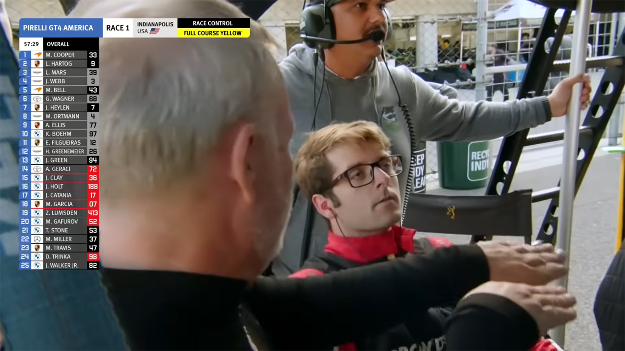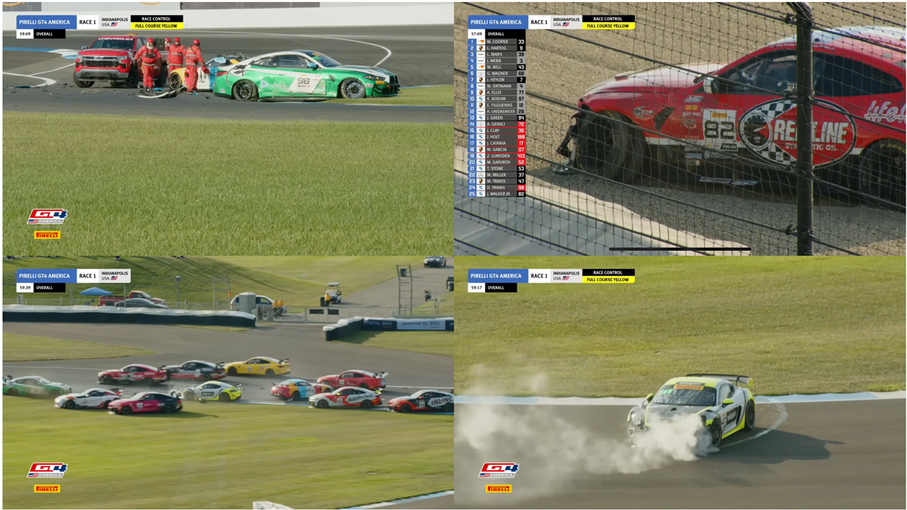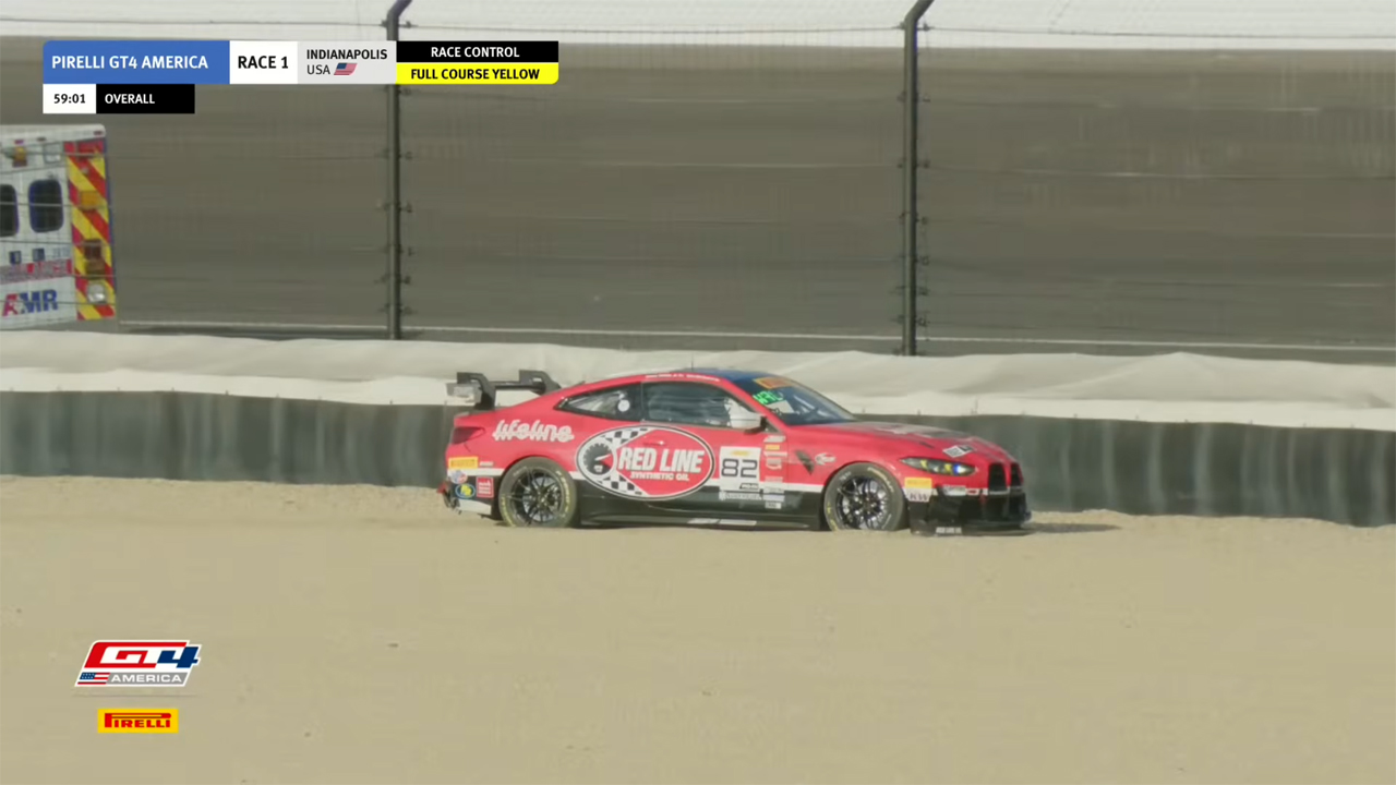 A: Generally, it has help. I recommend replaying the start of Saturday’s race at 0.25x speed to understand the cascading series of collisions that led to the Red Line Oil machine sitting way off track shortly past Turn 2. The shortened version is that “four-into-one doesn’t go.” Roughly the first half of the GT4 field made it past Turn 1 of the Indianapolis Motor Speedway infield course, and my dad was unfortunately amidst the second half, as one of the only Am drivers to start Race 1, so he went bonk. [Dad edit: I didn’t go bonk, I was caused to go bonk. There is a meaningful difference.]