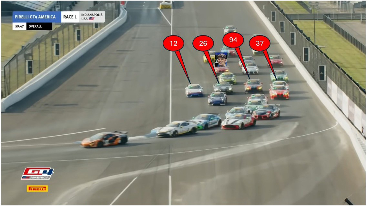A: When the pack was coming down the pit straight on lap one, of course. The #12 Silver-class Porsche got a good jump at the start and was able to squeeze down the inside of the #26 Aston Martin going into the right-hander that is Turn 1. No contact was made there, but the #26 had to check up slightly and move to the left to let the Porsche through. This meant the #94 BMW (the Random Vandals, one of the three Pro-Am championship contenders) also had to move to the left, towards the #37 Mercedes. I’ve labeled them for your convenience. Notice how there are four cars side-by-side. This sometimes works out at this track – in IndyCar.