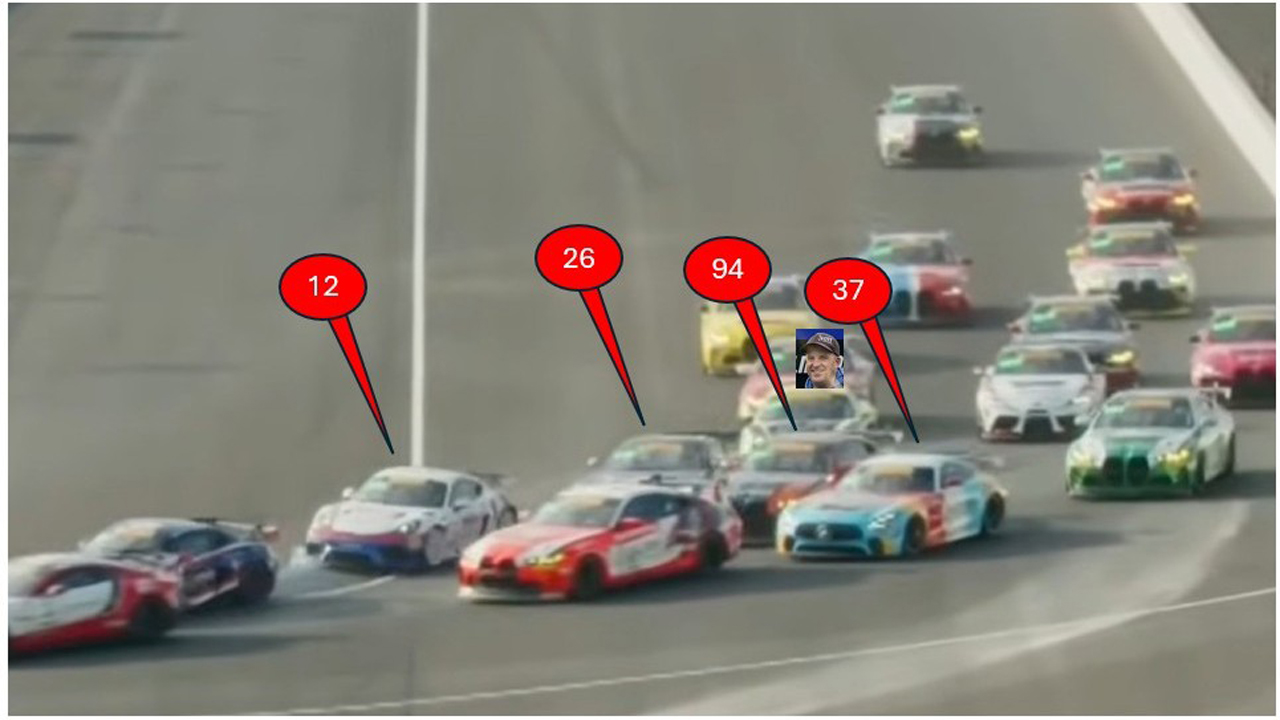 All was well until all of these little movements resulted in the BMW making contact with the Mercedes to his left who, of course, was taking the normal three-wide first lap racing line on the outside of the Turn 1. The only problem was that he now had three cars between himself and the apex, instead of the expected two.