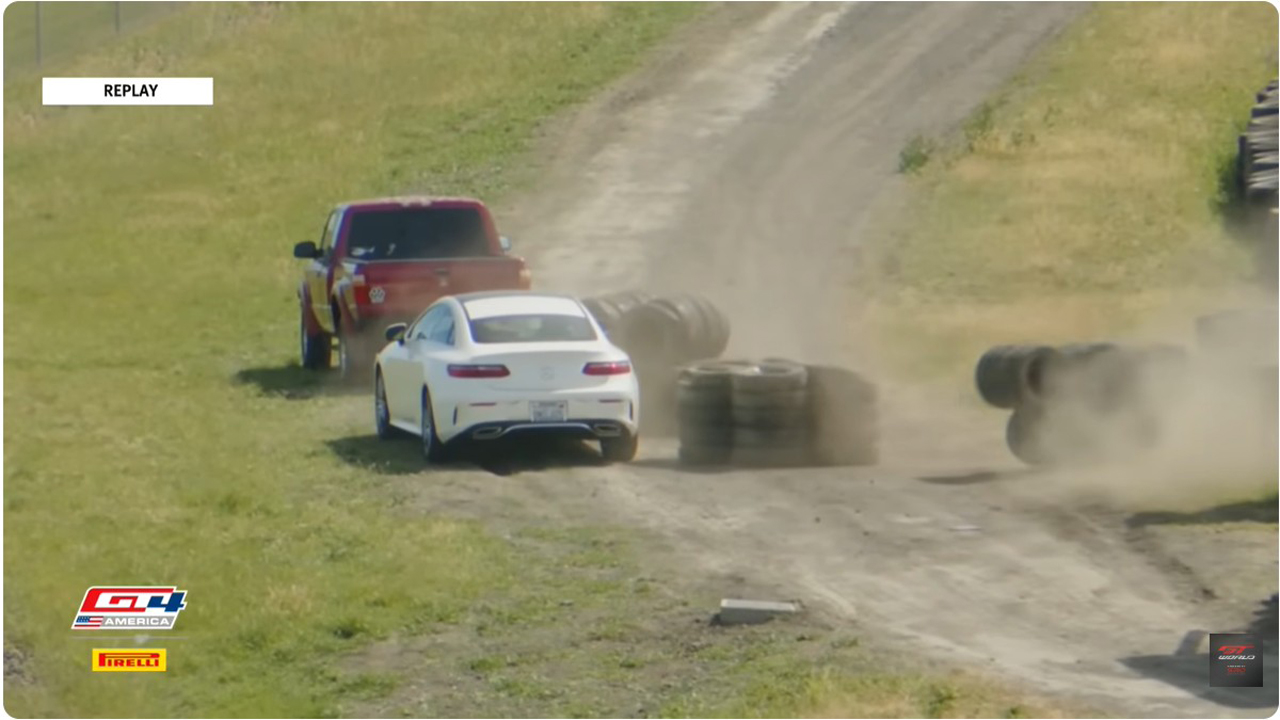 A: More or less. Someone directly in front of my dad (might have been the defending Pro-Am champ) got a little eager on Turn 3 of Lap 1 and got into the driver’s door of the Buc-ee’s Mercedes to his right, rotating it counterclockwise. The Am polesitter (sponsored by PolePace…how accurate) to my dad’s right at this moment had nowhere to go and therefore plowed into the Mercedes…you know, this is all sounding very familiar.
